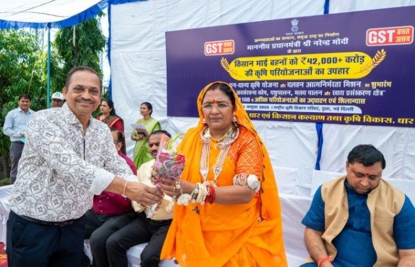 प्रधानमंत्री जी द्वारा शनिवार को राष्ट्रीय कृषि विज्ञान परिसर, पूसा, नई, दिल्ली से ‘‘प्रधानमंत्री धन-धान्य कृषि योजना’’ और ‘‘दलहन आत्मनिर्भरता मिशन’’ का शुभारंभ एवं कृषि अवसंरचना कोष, पशुपालन, मत्स्य पालन और खाद्य प्रसंस्करण क्षेत्र की 1100 से अधिक परियोजनाओं का उद्घाटन एवं शिलान्यास किया गया। कार्यक्रम का सीधा प्रसारण कृषि विज्ञान केन्द्र, धार में किया गया। कार्यक्रम में मुख्य अतिथि के रूप में केन्द्रीय, राज्य मंत्री, महिला एवं बाल विकास मंत्रालय, भारत सरकार श्रीमती सावित्री ठाकुर, विशिष्ट अतिथि श्री नीलेश भारती सहित जिले के लगभग 350 से अधिक कृषक एवं अधिकारी गण उपस्थित रहे।