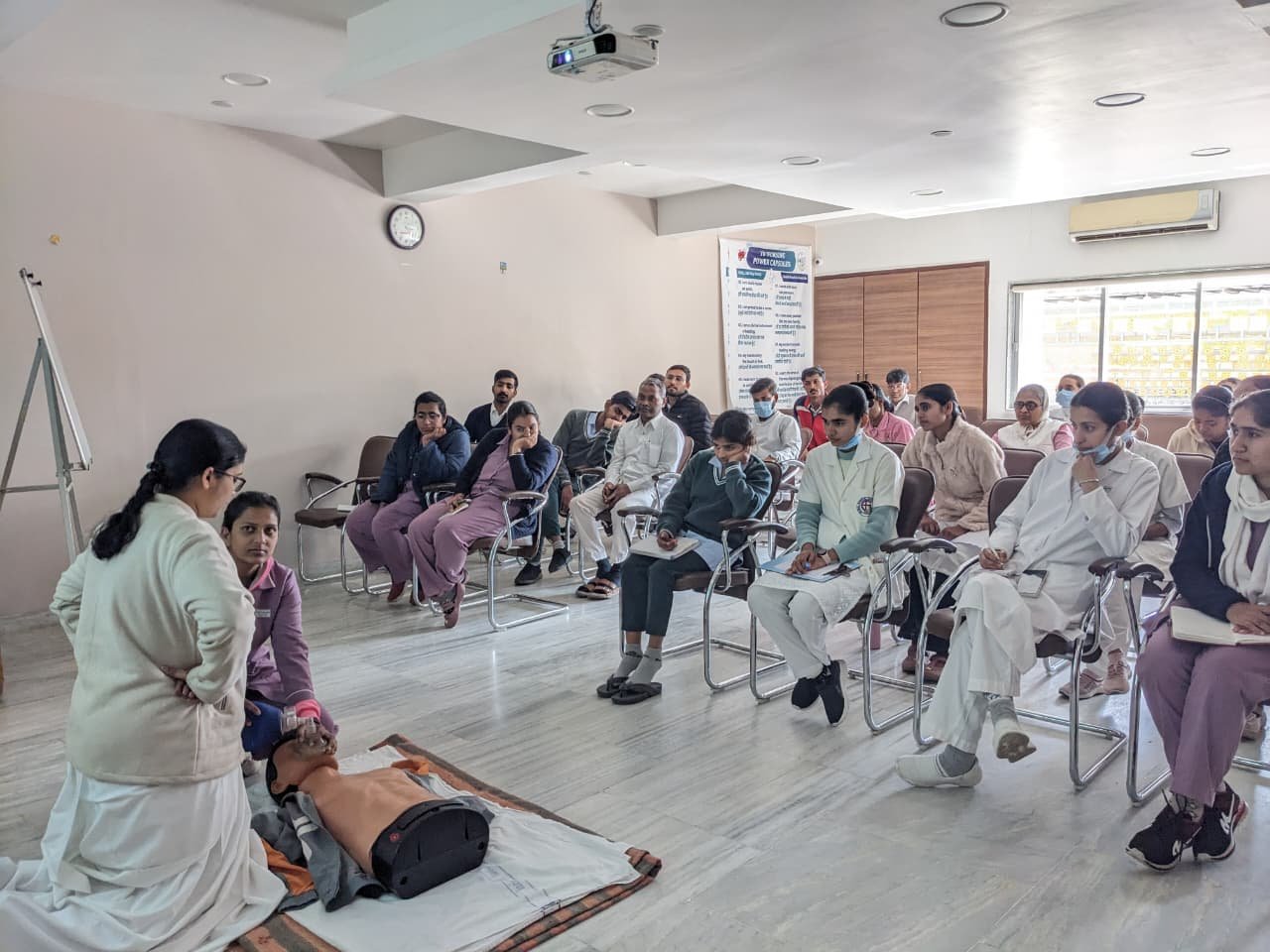 ग्लोबल हॉस्पिटल एंड रिसर्च सेंटर में महाराष्ट्र के प्रख्यात एनेस्थीसियोलॉजी डॉ शांतनु कुमार साहू के द्वारा बेसिक लाइफ सपोर्ट का प्रशिक्षण शिविर दो पारियों में आयोजित किया गया जिसमें हॉस्पिटल के सभी सुपरवाइजर, नर्सिंग स्टॉफ एवं पैरामेडिकल स्टॉफ ने भाग लिया इस शिविर में करीब एक सौ दस हॉस्पिटल स्टॉफ ने भाग लिया इस शिविर में डमी पर सभी को सी पी आर दिलवाया गया इस प्रशिक्षण शिविर में चीफ नर्सिंग सुपर वाइजर रूपा उपाध्याय आई सी यू इंचार्ज संजय भाई, ओ टी इंचार्ज चंपा राजपूत, कैजुअलिटी इंचार्ज संगीता कुमारी वार्ड इंचार्ज यशमिता कुमारी, मीना बहन, जयंती लाल मारू आदि स्टाफ उपस्थित थे इस शिविर के बाद चीफ नर्सिंग सुपर वाइजर रूपा उपाध्याय ने भाग लेने वाले सभी स्टाफ को प्रमाण पत्र दिए गए |