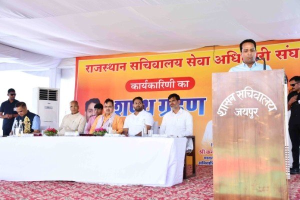 राजस्थान शासन सचिवालय में आयोजित राजस्थान सचिवालय सेवा अधिकारी संघ की नव-निर्वाचित कार्यकारिणी के भव्य एवं गरिमामय शपथ ग्रहण समारोह में मुख्य सचिव वी. श्रीनिवास की अध्यक्षता रही। समारोह में जन स्वास्थ्य अभियांत्रिकी विभाग (पीएचईडी) के कैबिनेट मंत्री कन्हैया लाल चौधरी विशिष्ट अतिथि के रूप में उपस्थित रहे। कार्यक्रम के मुख्य अतिथि प्रदेश के मुख्यमंत्री भजन लाल शर्मा ने सभी नव-निर्वाचित पदाधिकारियों को पद एवं गोपनीयता की शपथ दिलाई।