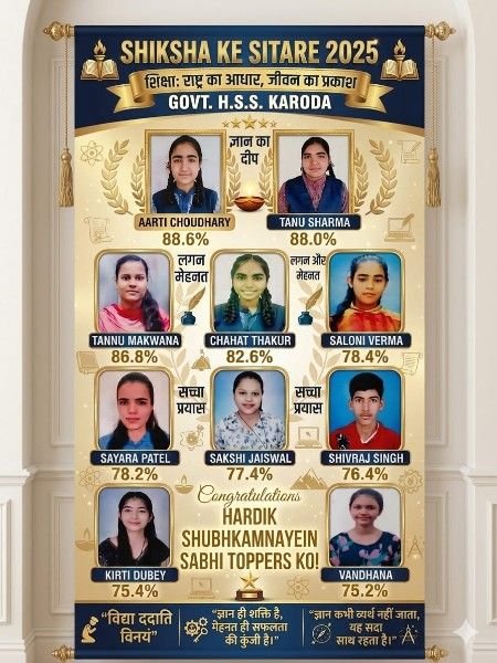 कक्षा 12वीं में छात्रा आरती प्रभुलाल चौधरी ने 88.6 प्रतिशत अंक प्राप्त कर विद्यालय में प्रथम स्थान हासिल किया और स्कूटी योजना के लिए पात्र बनीं। वहीं छात्र शिवराज सिंह पंवार ने 76.4 प्रतिशत अंक प्राप्त कर स्कूटी योजना के लिए पात्रता प्राप्त की।